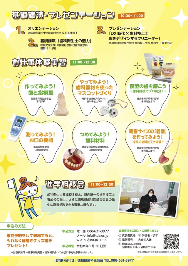 公開日 2025年12月10日 徳島県内の歯科衛生士養成校の五校は2月11日[水・建国記念の日]に、生徒と保護者の皆さんに向けたお仕事体験と進学相談会を開催します 参加のお申し込みは下のボタンよりお願いします 参加申し込みはこちら 相談会の会場はあわぎんホールです