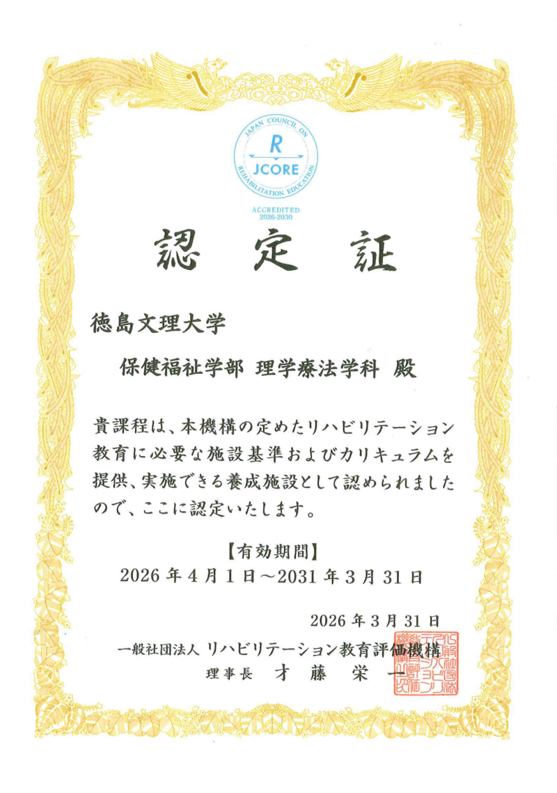 この度、当学科は一般社団法人 リハビリテーション教育評価機構(JCORE)による審査を受け、同機構が定める施設基準およびカリキュラムの基準を満たす「認定校」として正式に承認されました。