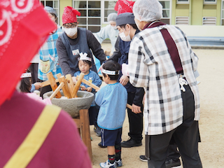 園児たちは、順番に杵を持ってお餅をつく体験をします。