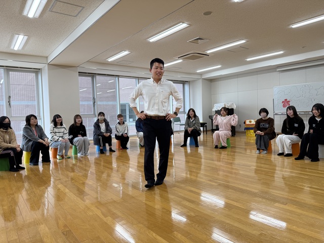4月17日(金) 保育科1年生と2年生の交流会を行いました。ちょっと緊張しながら、最初に自己紹介。名前と好きな食べ物や自分の推しについて話しました。