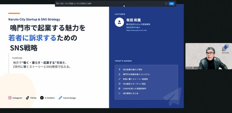 まずはオンラインでの事前学習からスタート。鳴門市が進める起業支援や移住促進の現状を学び、活動の舞台となる地域への理解を深めました。また、SNS戦略のプロから、取材の成果を効果的に発信するための「見せ方」や、デザインツール「Canva」を使った動画編集の基礎を伝授してもらい、フィールドワークに向けた準備を整えました。